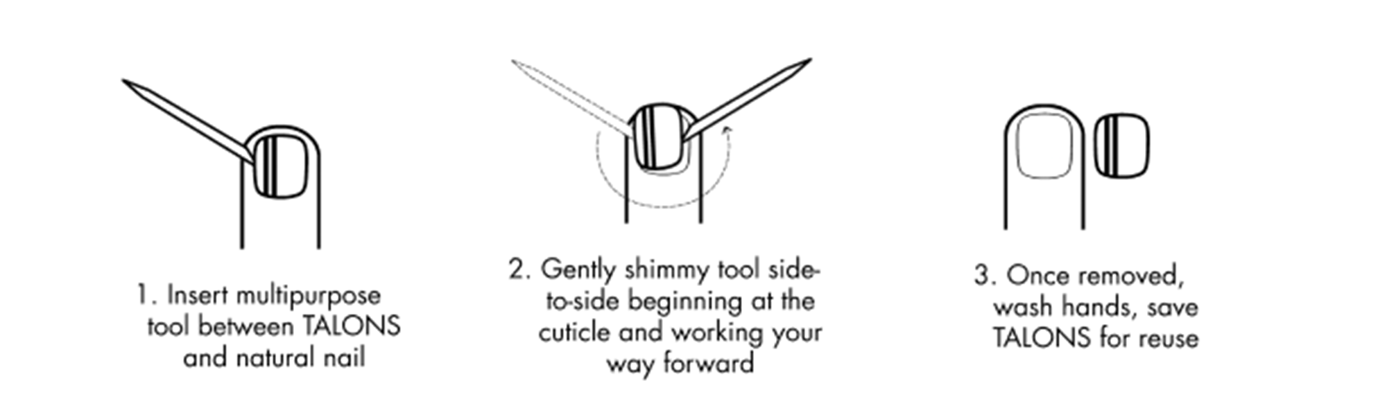 - Avoid immediate hot water or steam after applying Talons as it will loosen the adhesive reducing the effectiveness of the bond.