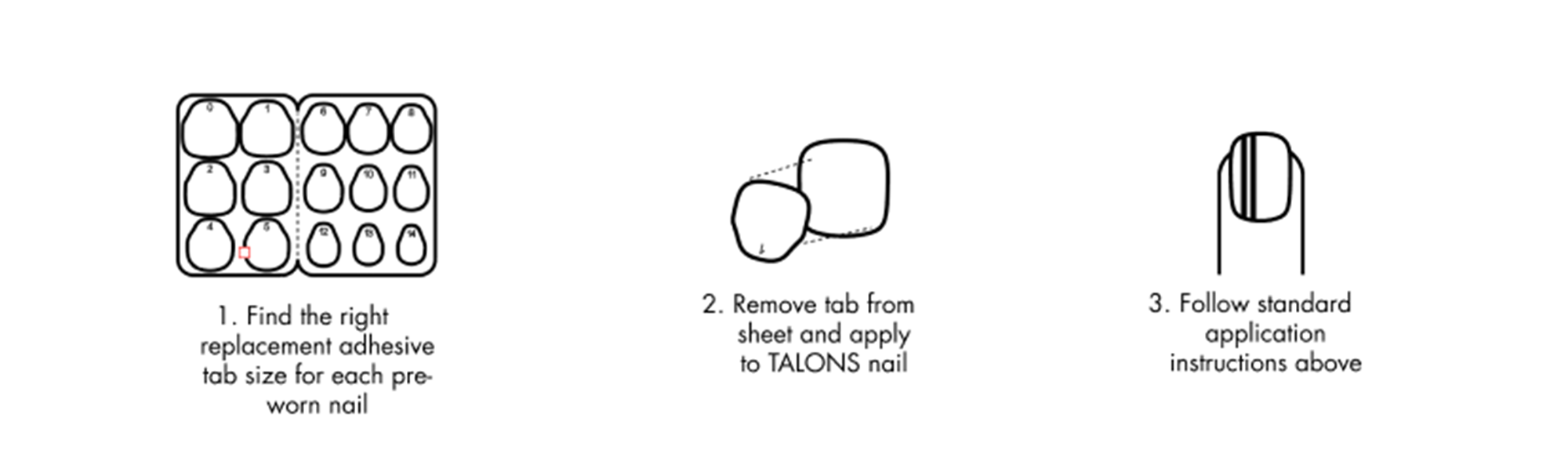 - Get the fit right the first time. With the film still covering the adhesive, hold each nail up to your finger to gauge the correct sizing. *Removing Talons from your nail once they have been applied will negatively impact adhesion.